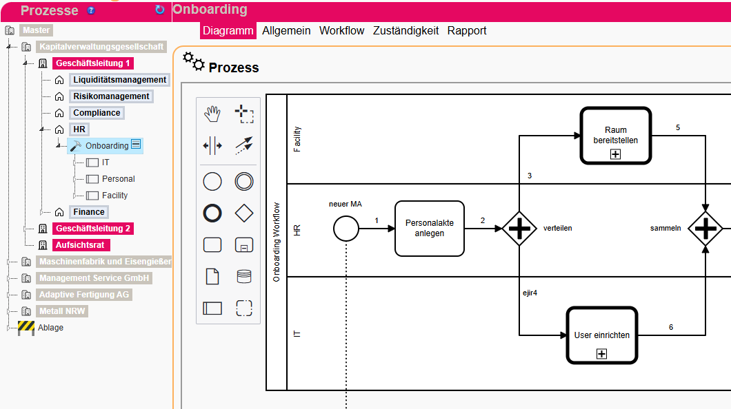 Wenn Analysen und Veränderungen in der Aufbau- und Ablauforganisation stattfinden, bedarf es Werkzeuge, um dies angemessen zu bewerkstelligen. Ein Standardsystem zu realisieren oder auf das Modul in SAP zu warten ist üblicherweise mit großen Hürden verbunden. Aus diesem Grund steht für Projekte ORGA as a Tool zur Verfügung, mit dem Organigramme, Prozesse und vieles mehr verwaltet und modelliert werden können.